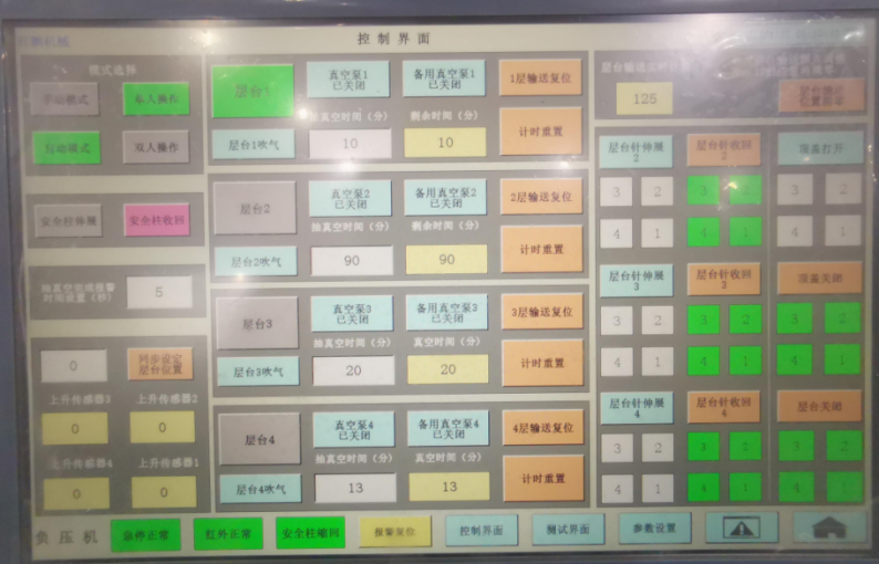 真空系统由5台真空泵、稳压箱、真空传感器、数字微压控制系统(精度级别0.3Kpa)、PLC控制界面、真空管道等组成。多个数量的层台抽真空系统,均可独立应用,当一个层台在工作时,不影响其它层台进出板件及压制生产作业。设置的备用泵,在有主真空泵维护时,可一键切换到备用泵抽真空,可保证板件的连续压制。
