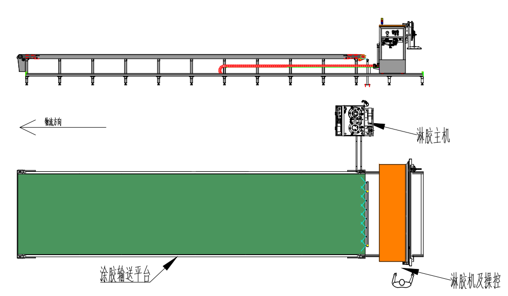 输送带平台高度为1112mm,长度为14480mm,平台由一条3米宽的循环传输PV皮带、驱动部分及台体部分组成,把淋胶的板件放置在平台传输皮带上,护出胶宽溢出的部分,即可对板件进行淋胶。