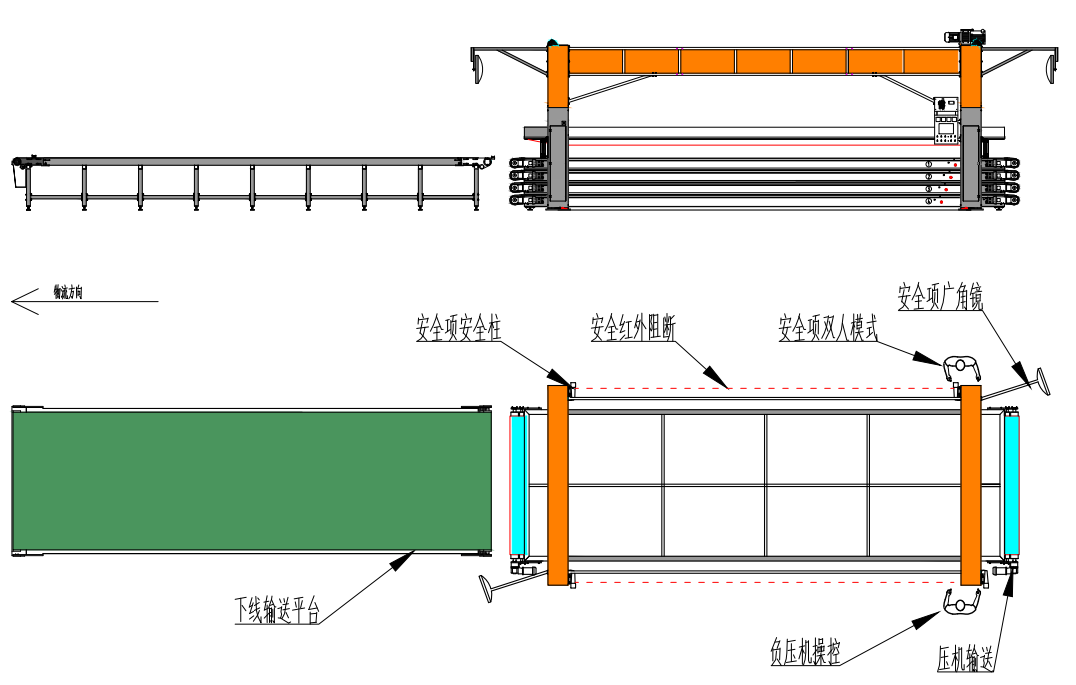 在平台板面上安装有自动往复式输送带,主要由输送带、驱动电机、驱动滚筒、电控传感部分组成。在进入板件及输出板件时,触发控制按键,可实现自动输送。在平台板面上安装有自动往复式输送带,主要由输送带、驱动电机、驱动滚筒、电控传感部分组成。在进入板件及输出板件时,触发控制按键,可实现自动输送。